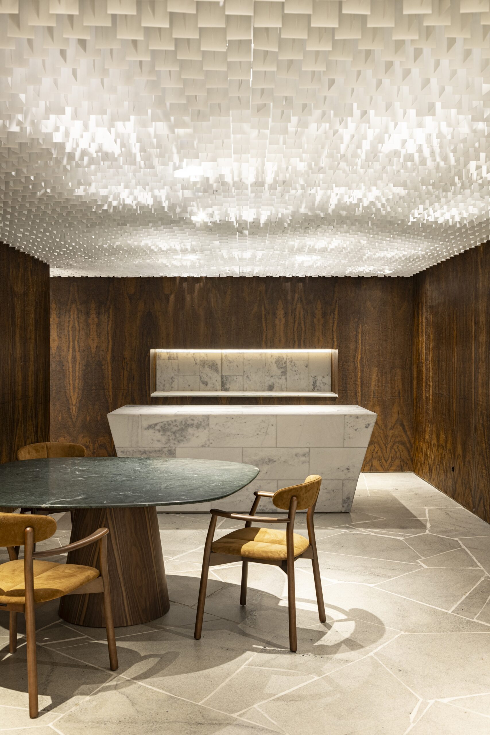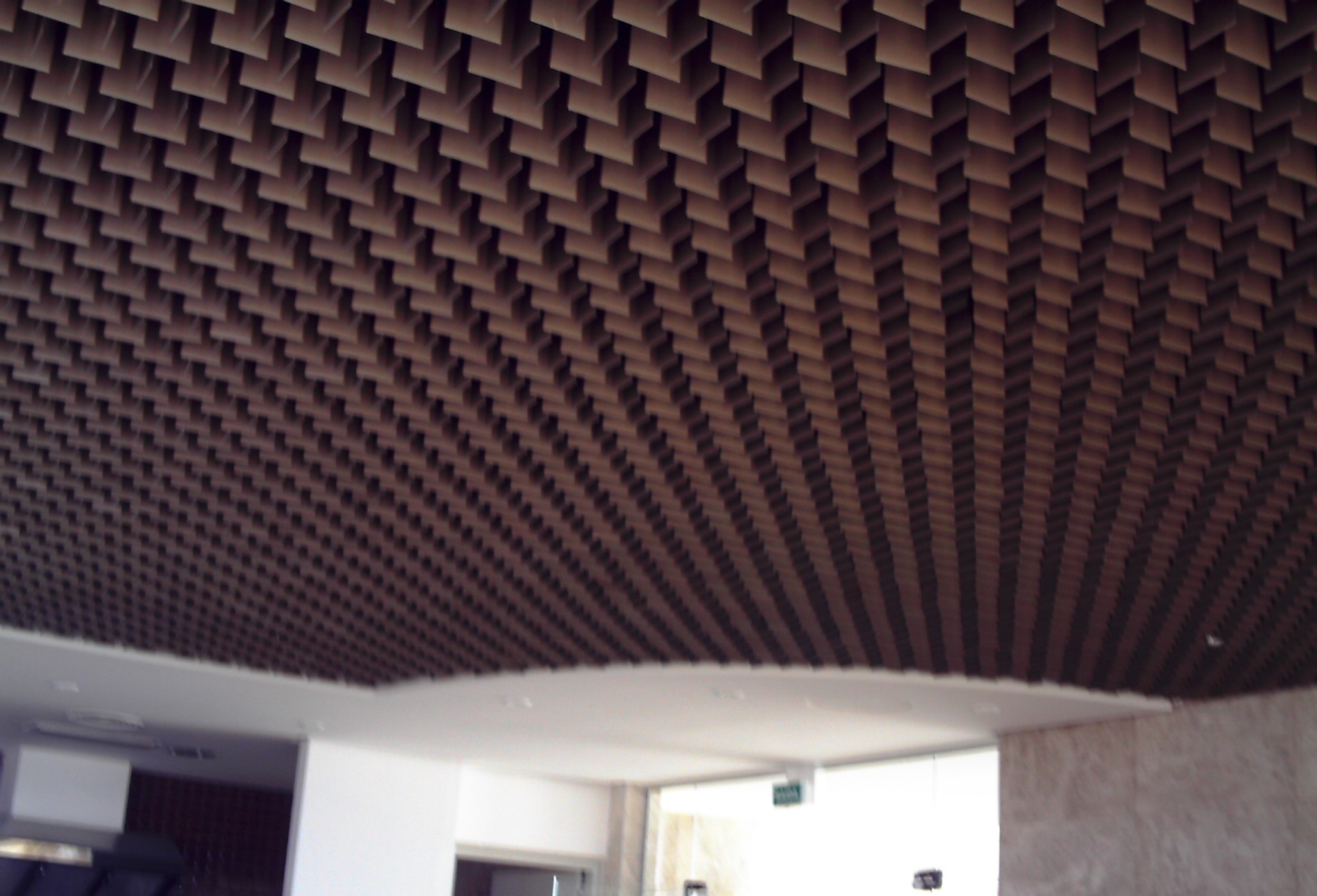 Es un falso techo decorativo y abierto, compuesto por placas colgadas de forma alternada a través de una estructura oculta, lo que permite un mayor movimiento visual. Como las rejillas quedan simplemente apoyadas, su remoción es sencilla, permitiendo el acceso a las instalaciones del techo.